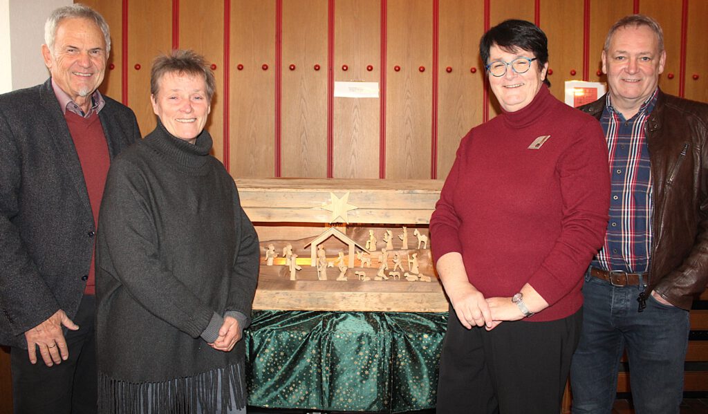 Das Foto zeigt Ortsvorsteher Klaus Nunn und die drei Kinder von Alfred Oberle vor einer Weihnachtskrippe, die Oberle für Willi Monke in eine alte Truhe hineingebastelt hat.