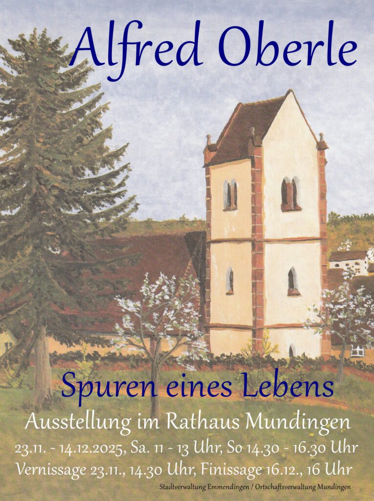 Alfred Oberle, geb. 1930 in Weisweil, verstorben 2020 in Mundingen, lebte und arbeitet über 60 Jahre in Mundingen – als Schulrektor, Gemeinderat, Organist, Dirigent des Kirchenchores, Heimatforscher, Maler, Fotograf, Bastler, Modellbauer und vieles mehr. In der Ausstellung sind beispielhaft zahlreiche seiner Werke zu sehen, von beweglichen Modellen der Maschinen in der Mundinger Mühle bis zu einer äußerst seltenen Osterkrippe, von seinen Heimatkalendern bis zur Wurfbude für seine Schüler, von der Dokumentation der Ausgrabungen der Alemannengräber bis zur diffizilen Bauanleitung des Fröbelsternes. Die Ausstellung ist samstags von 11 bis 13 Uhr und sonntags von 14:30 bis 16:30 Uhr geöffnet. Finissage ist am Todestag von Alfred Oberle am Dienstag, 16. Dezember um 16 Uhr.