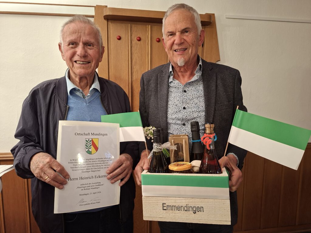 Insbesondere für seine Verdienste zur Wiederinbetriebnahme des Wasserrades der Mundinger Mühle und der Pflege dieser Oase am westlichen Ortseingang von Mundingen wurde der Vorsitzende des Fördervereins Mundinger Mühle, Fritz Mack, am 12. Mai 2025 mit der Ehrennadel des Landes Baden-Württemberg ausgezeichnet. Herzlichen Glückwunsch!