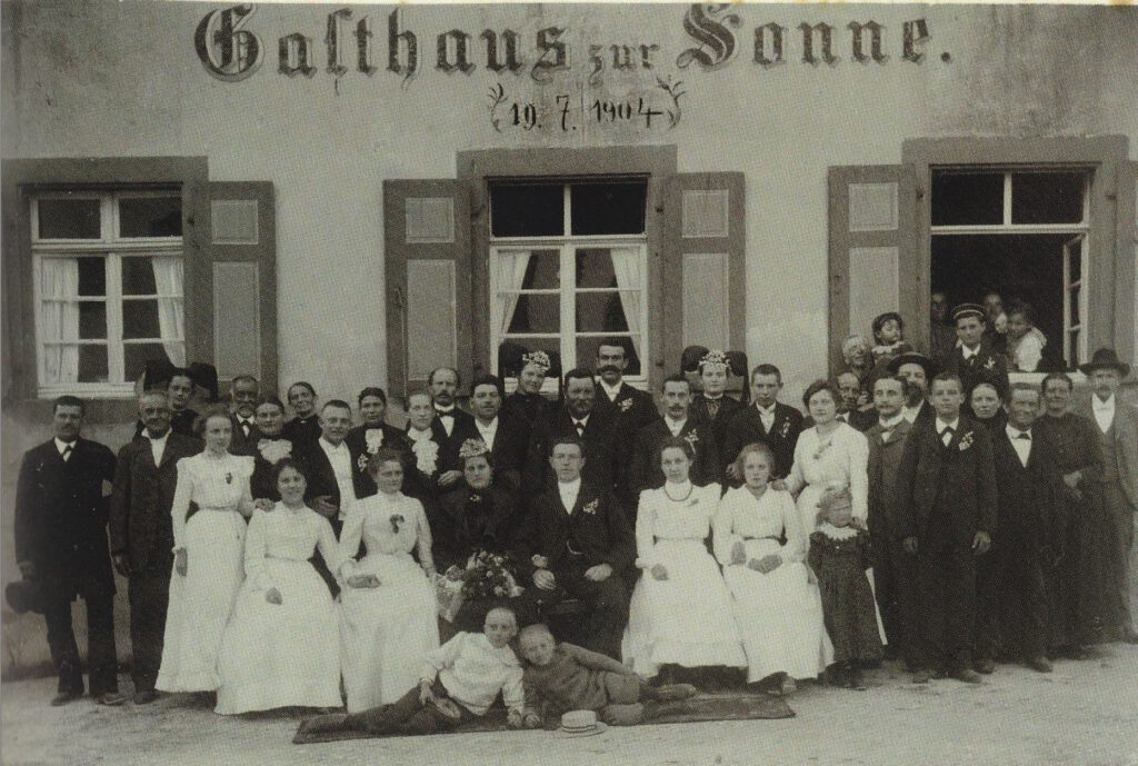 Hochzeit des Albert Krayer und der Wilhelmine Ehrenfelder am 19. Juli 1904 im Gasthaus zur Sonne (Emma Pleuler, Karin Werner: Das war damals noch eine heile Welt, Mundingen 2014, Seite 55)